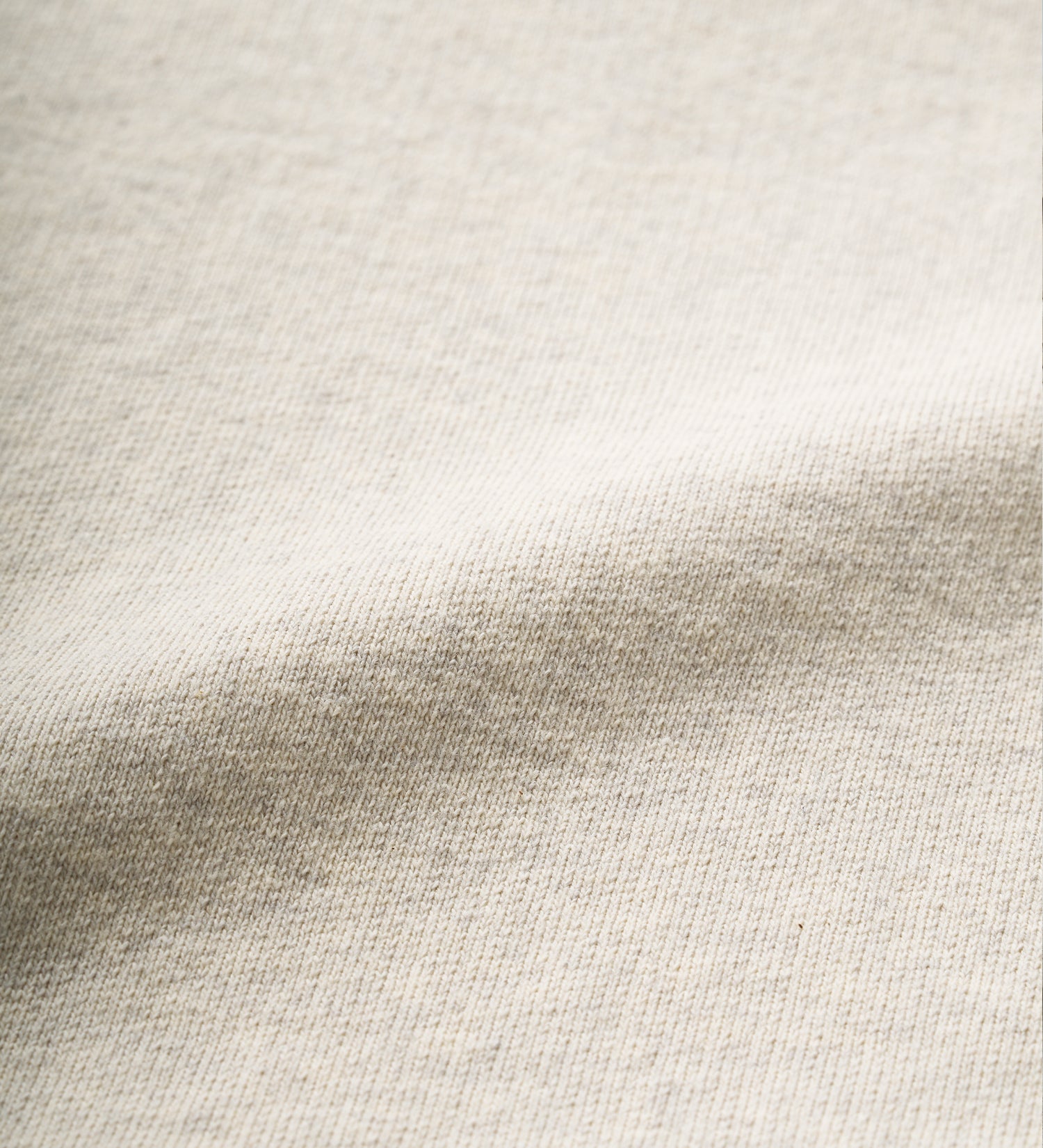 ヘビーオンスの裏毛起毛素材を使用し、重厚感ありながらも柔らかな風合いが特徴。