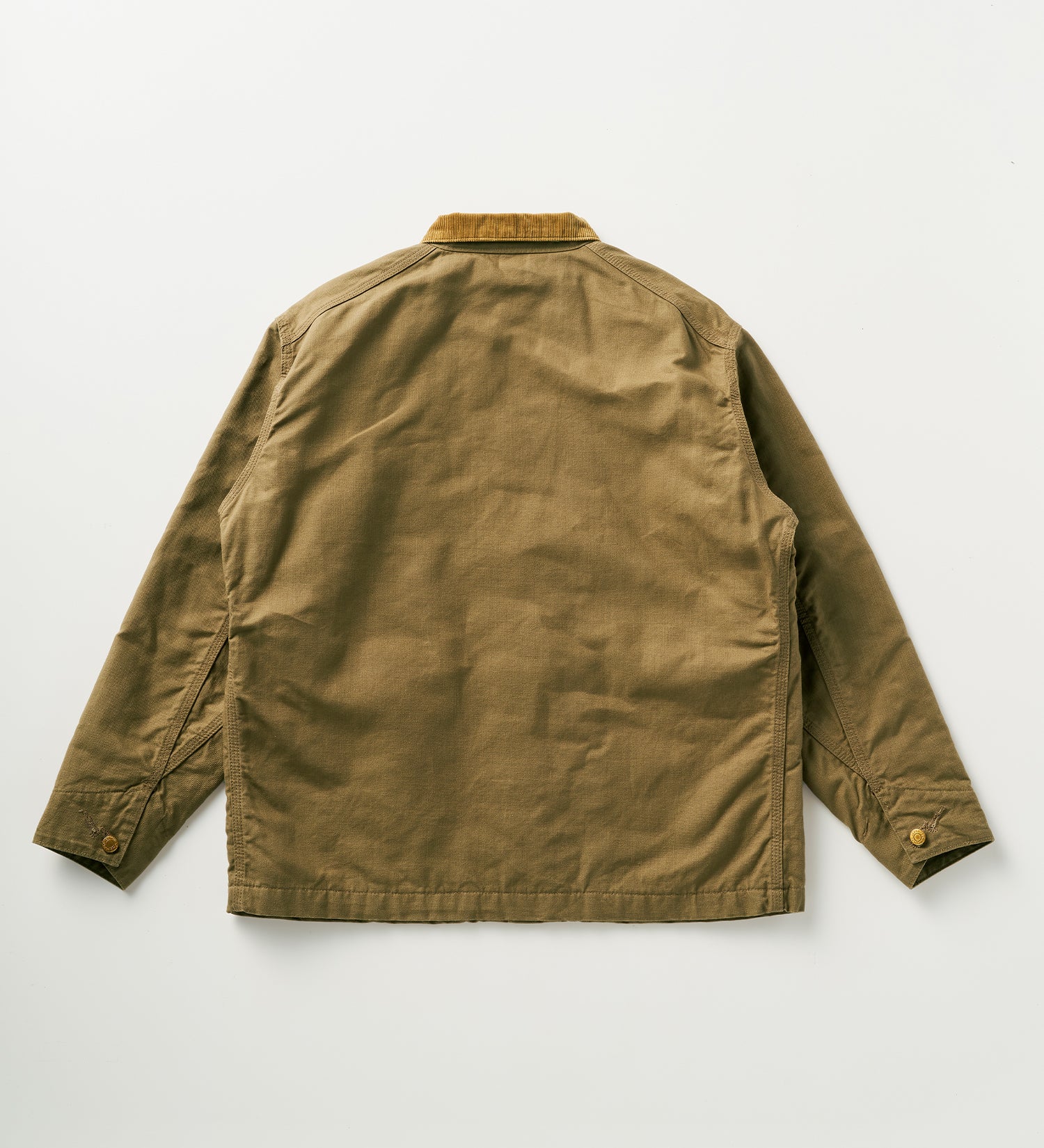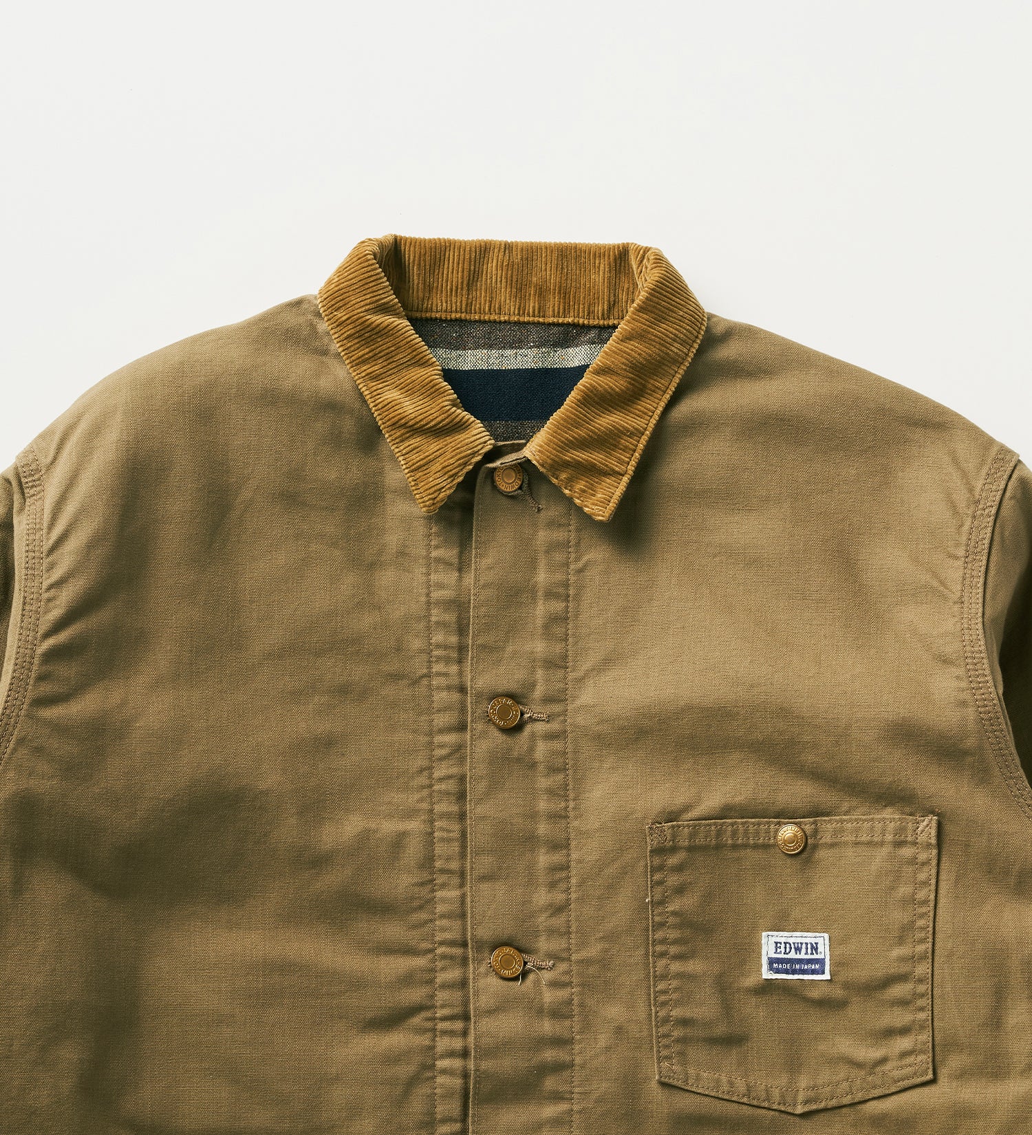 襟のコーデュロイは硫化染めなので身頃と共に色落ちを楽しめる。