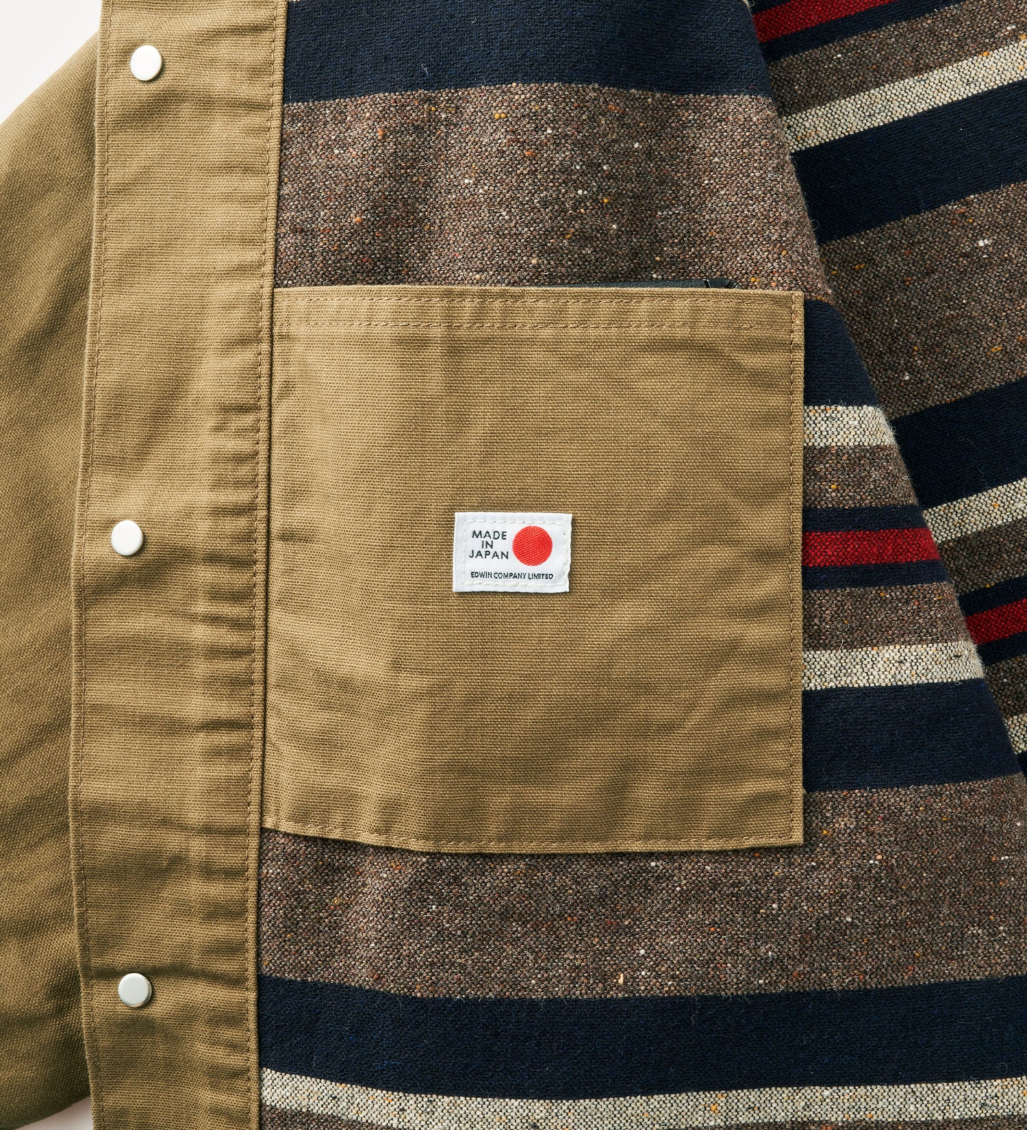 ムラ糸を使用した表情のあるダック生地にパラフィン加工を施し、特有のチョークマークが出るのが特徴。