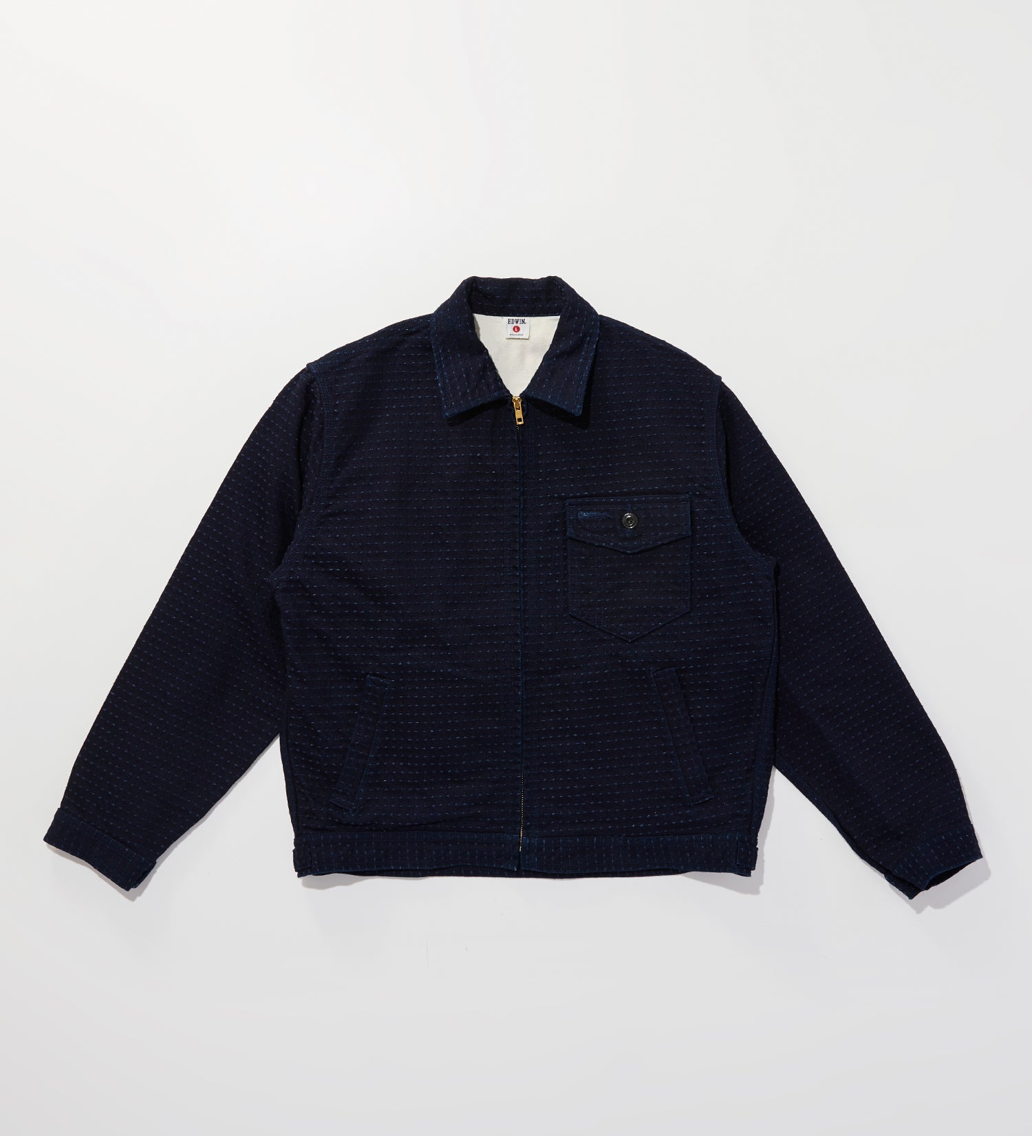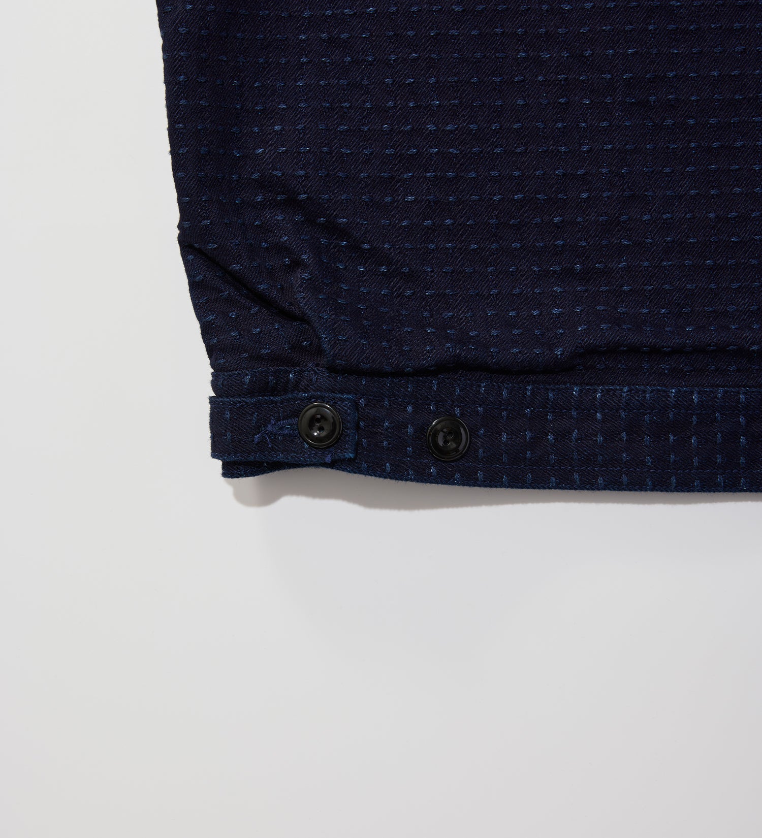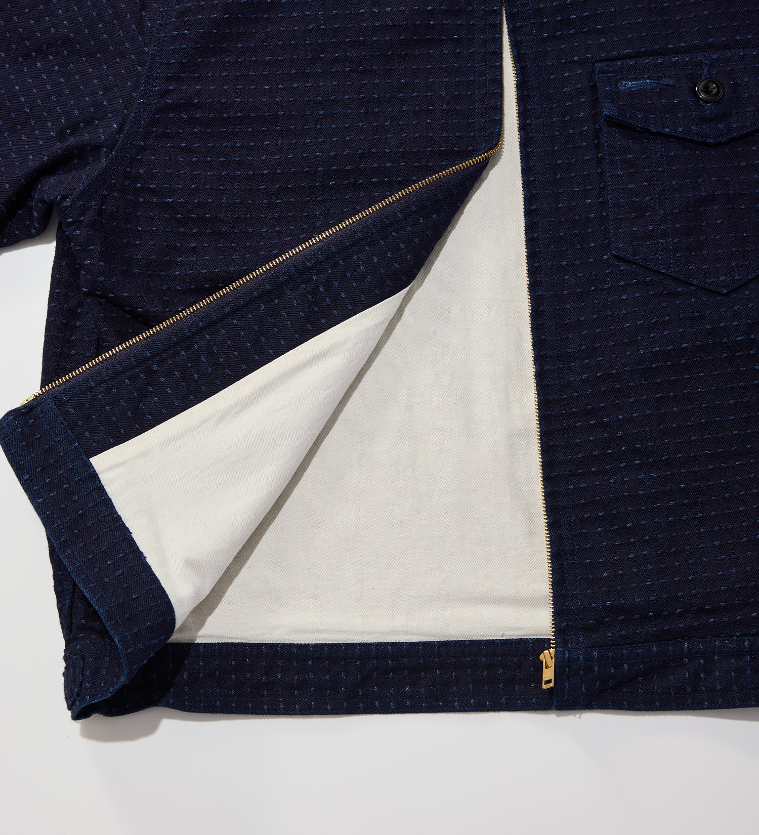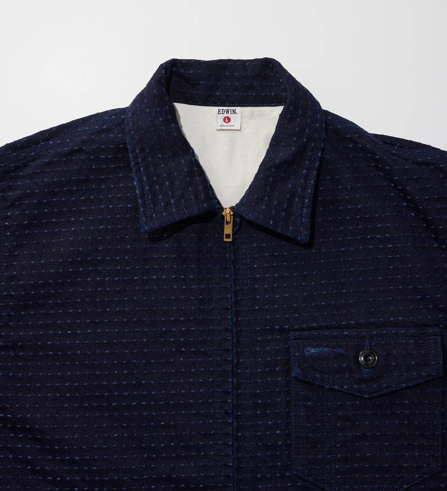コンセプトショップ定番のワークジャケットをベースに15.9オンスの十字刺し子のジャガード生地を使用したジャケット。