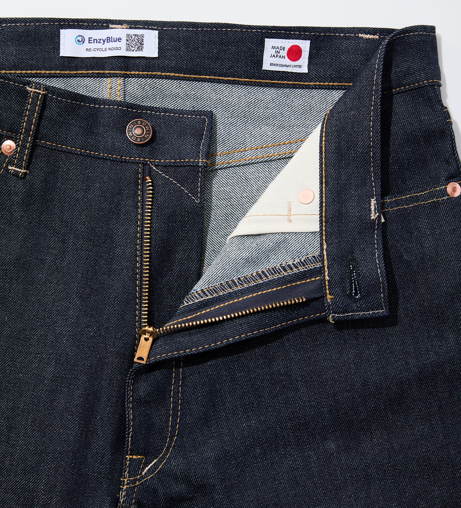 最古のジーンズを単純に復刻させるのではなく、今回の商品には最新の技術で開発されたデニム生地を採用している。このデニム生地の染色には一般的な合成インディゴではなく、最新の技術開発によって実現した、廃繊維から再生したリサイクルインディゴ染料「EnzyBlue(エンジーブルー)」を使用。